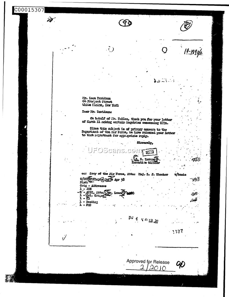 This is a 1958 letter acknowledging an inquiry from Leon Davidson regarding UFOs and confirming that the matter was referred to the Department of the Air Force for a response.