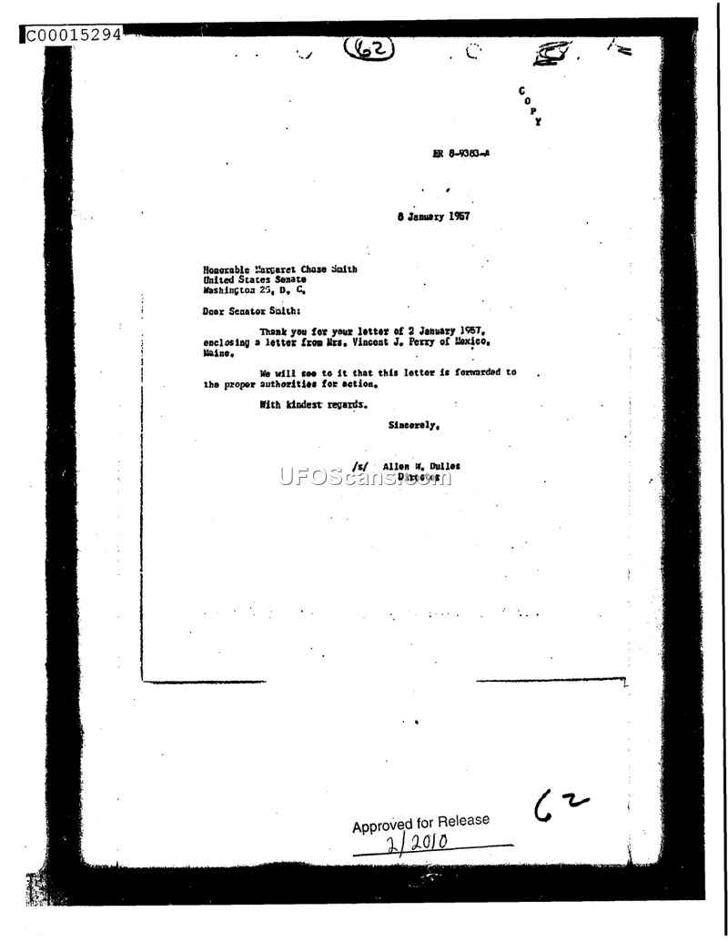 Correspondence from Allen W. Dulles to Senator Margaret Chase Smith regarding Mrs. Vincent J. Perry