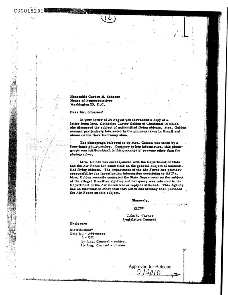 This document consists of correspondence regarding an inquiry from Mrs. Catherine Carter Golden of Cincinnati, Ohio, directed to Representative Gordon H. Scherer. Mrs. Golden sought information regarding unidentified flying objects, specifically referencing photographs taken in Brazil that were featured on the Dave Garroway television program. The document clarifies that the Department of the Air Force holds primary responsibility for investigating UFO-related information. The Agency states it possesses no information regarding the Brazilian sighting beyond what the Air Force has already provided. Additionally, the document references the Scientific Advisory Panel on Unidentified Flying Objects, which included members such as Dr. H. P. Robertson and Dr. Lloyd V. Berkner, and discusses the potential declassification of certain panel findings. The correspondence concludes with a request for the Air Force to provide information that could be shared with the public.