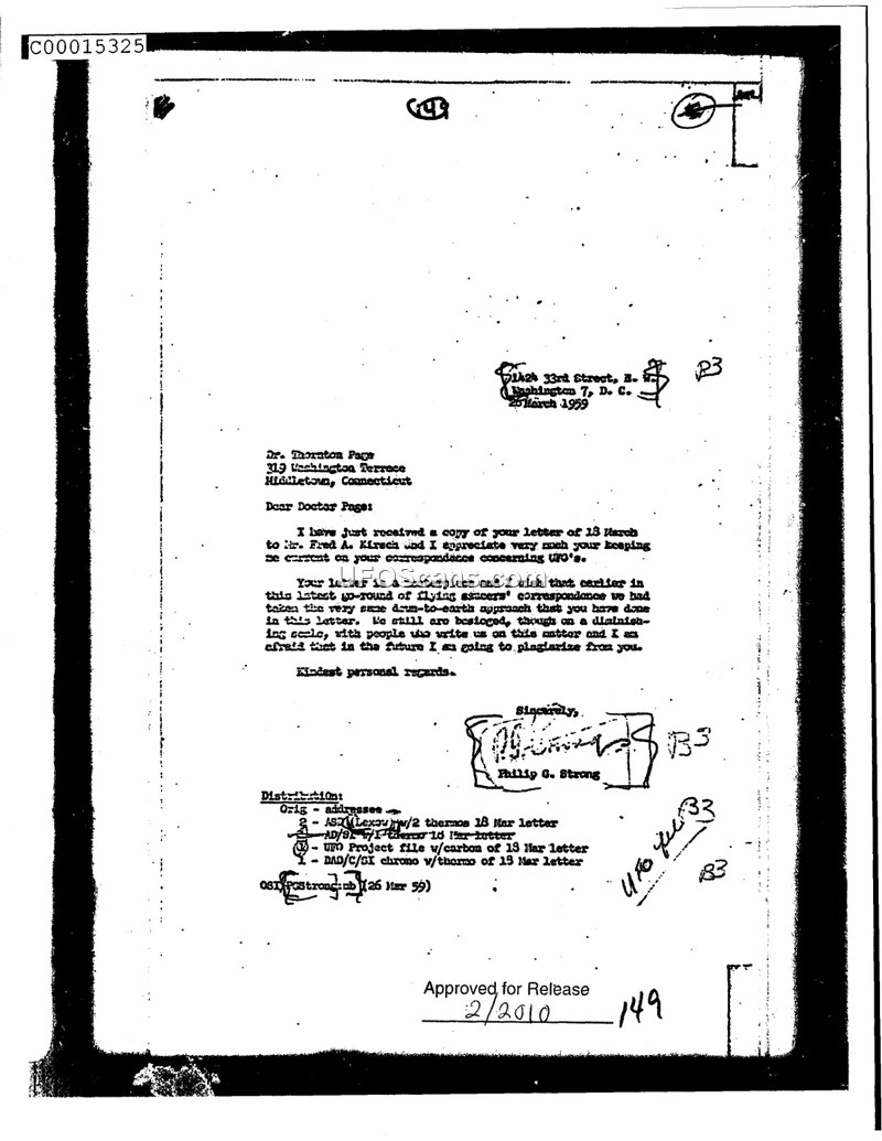 Correspondence from Philip G. Strong to Dr. Thornton Page regarding UFOs
