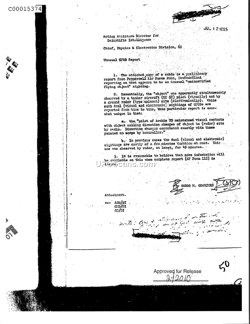 This memorandum, dated July 12, 1955, and authored by Todos M. Odarenko of the Physics & Electronics Division, SI, serves as an internal report regarding an unusual Unidentified Flying Object (UFO) sighting. The document references a preliminary cable report originating from Pepperrell Air Force Base in Newfoundland. The core of the report concerns a sighting involving a tanker aircraft, identified as a KC-97, whose pilot maintained visual contact with an object. Simultaneously, a ground radar site, the type of which is unknown, tracked the object electronically. The author notes that this specific incident is considered unique because the pilot of the aircraft, referred to as 'Archia 29,' was able to report direction changes of the object via radio, which correlated exactly with the movements observed by the controller on the radar scope. Furthermore, the duration of the observation, which lasted for 49 minutes, is highlighted as being significantly longer than typical sightings, which the document notes usually last only a few minutes. The memorandum concludes by stating that further information is expected to be provided upon the issuance of the complete AF Form 112 report.