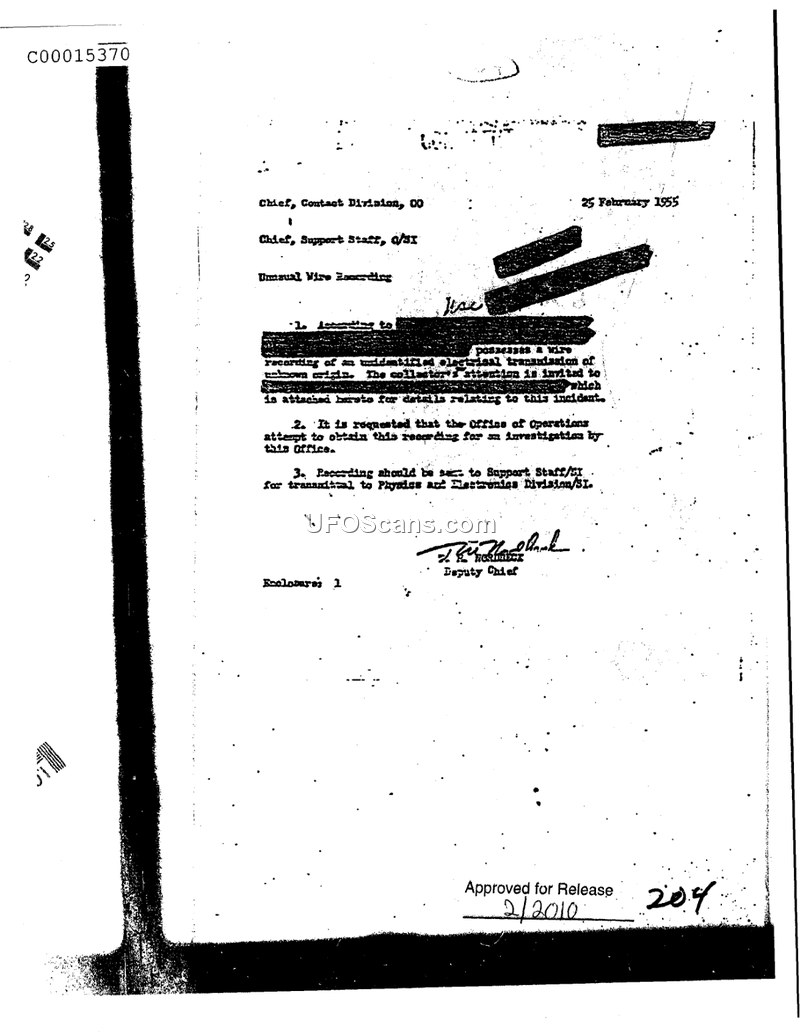 This memorandum, dated 25 February 1955, concerns an 'unusual wire recording' containing an unidentified electrical transmission of unknown origin. The document notes that an unnamed entity possesses this recording. The author, a Deputy Chief, requests that the Office of Operations attempt to obtain the recording for further investigation. Furthermore, the document directs that the recording be sent to the Support Staff/SI for subsequent transmittal to the Physics and Electronics Division/SI. The document includes one enclosure, which is referenced as containing details relating to the incident.