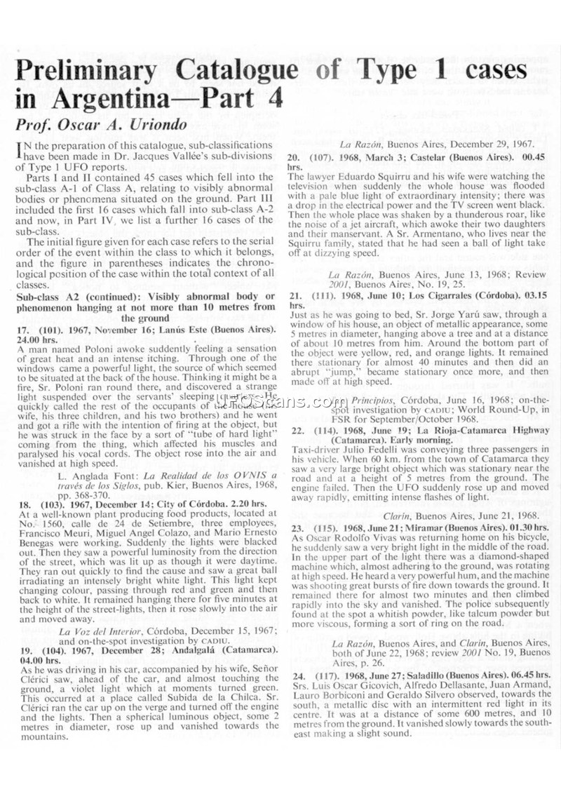 This document, authored by Prof. Oscar A. Uriondo, presents the fourth part of a preliminary catalogue of Type 1 UFO reports in Argentina. The catalogue follows the sub-divisions established by Dr. Jacques Vallée, focusing on sightings of objects or phenomena on the ground. The report details numerous incidents occurring between 1967 and 1970. These sightings often involve objects described as metallic, spherical, or cigar-shaped, frequently accompanied by reports of intense light, heat, and electromagnetic interference, such as power drops or engine failures. Witnesses reported various physiological effects, including paralysis and sensations of heat. Physical evidence, such as scorched vegetation, sulfurous smells, and mysterious powders, was noted in several cases. The document also includes a brief section titled 'The Investigations of General Uchoa in Brazil—Part 3,' written by Gordon Creighton, which describes a group of investigators observing strange aerial phenomena in Brazil. The text serves as a historical record of reported UFO activity in South America during the late 1960s and early 1970s, documenting witness testimonies and observed physical anomalies.