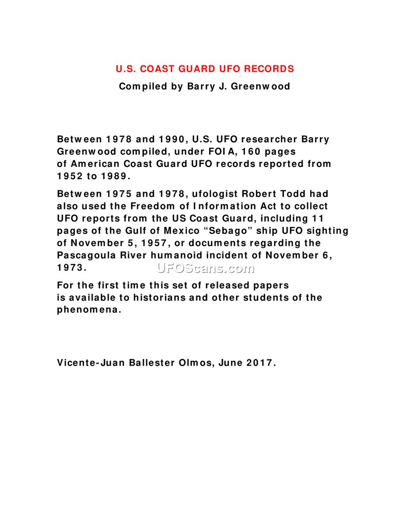 This document is a comprehensive compilation of U.S. Coast Guard records concerning Unidentified Aerial Phenomena (UAP) and Unidentified Submerged Objects (USO), assembled by researcher Barry J. Greenwood. The collection spans reports from 1952 through 1989, totaling 160 pages of declassified material. The compilation includes significant historical documentation, such as the 1957 'Sebago' ship sighting in the Gulf of Mexico and the 1973 Pascagoula River incident. The records were obtained through multiple Freedom of Information Act (FOIA) requests filed by researchers including Barry Greenwood and Robert Todd. The document serves as a primary source for historians and students of the phenomena, providing access to official correspondence, incident reports, and internal Coast Guard communications regarding these sightings. The correspondence within the file reveals the Coast Guard's official stance over several decades, often stating that they do not maintain specific UFO files and that reports are typically forwarded to the U.S. Air Force's Project Blue Book or other relevant military authorities. The collection also documents specific search and rescue (SAR) operations that were initiated following reports of unidentified objects, which were often later attributed to meteors, flares, or misidentifications. The compilation includes detailed logs, message traffic, and internal memoranda from various Coast Guard districts, including the Eighth and Ninth Coast Guard Districts, as well as specific incident reports from the 1980s and 1990s, such as the 1988 Eastlake, Ohio, sightings and the 1989 Moriches Bay incident. The document highlights the tension between civilian reports of anomalous phenomena and the official military and government response, which frequently sought to categorize these events as conventional occurrences or hoaxes. The inclusion of correspondence between the Coast Guard and researchers like Robert Todd and Barry Greenwood underscores the ongoing efforts to secure transparency regarding government knowledge of UAP/USO events.
