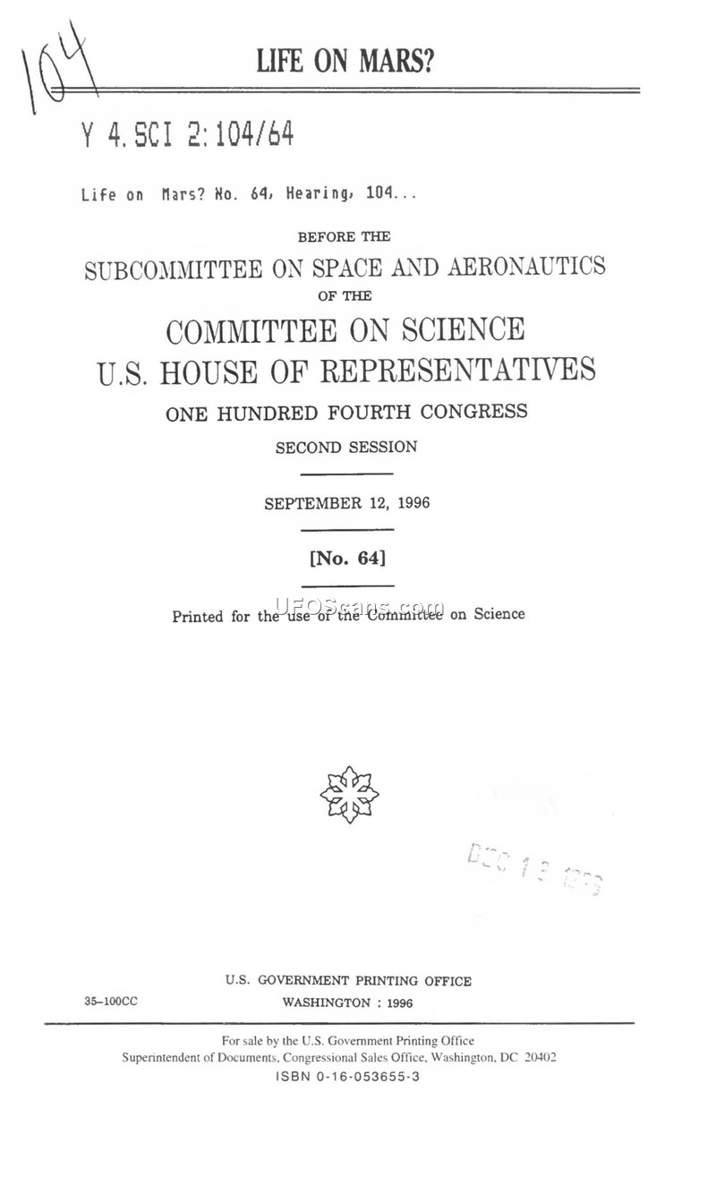 Life on Mars? Hearing before the Subcommittee on Space and Aeronautics of the Committee on Science, U.S. House of Representatives, September 12, 1996