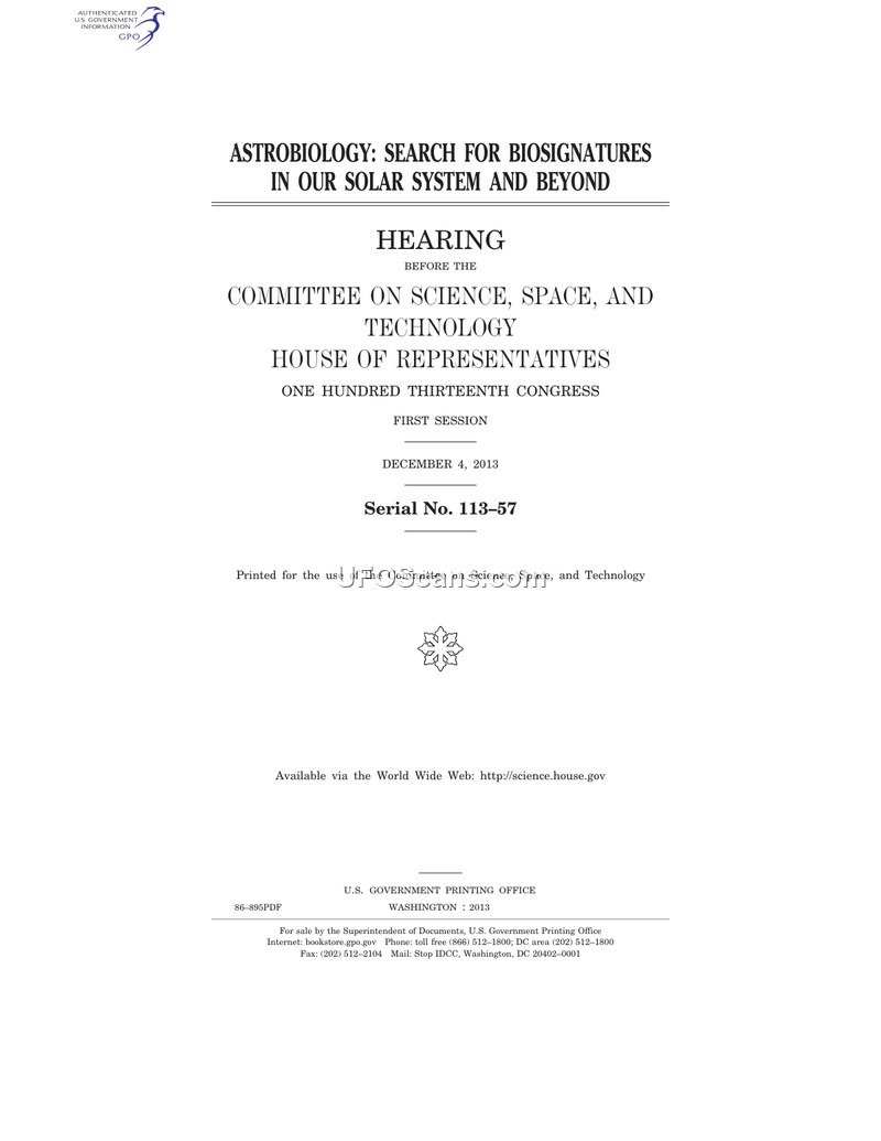 This hearing transcript details the 2013 congressional review of NASA's Astrobiology Program, focusing on the search for biosignatures and exoplanets. Experts testified on the scientific, technological, and societal importance of astrobiology, advocating for continued long-term funding and international collaboration.