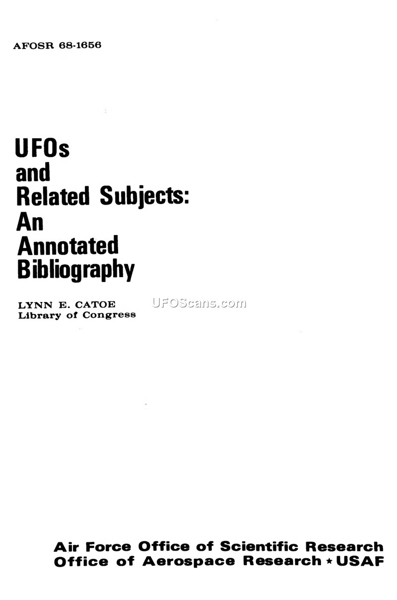 This document is an annotated bibliography titled 'UFOs and Related Subjects,' prepared by Lynn E. Catoe of the Library of Congress, Science and Technology Division, for the Air Force Office of Scientific Research (AFOSR). Published in July 1969, the work was commissioned to assist the scientific research project at the University of Colorado, which was led by Dr. Edward U. Condon. The bibliography contains over 1,600 items, including books, journal articles, pamphlets, conference proceedings, tapes, and original manuscripts. The foreword explains that the survey was initiated on November 1, 1966, under contract F44620-67-C-0035 and AFOSR project orders 67-0002 and 68-0003. The bibliography covers a wide range of topics related to the UFO phenomenon, including sightings, abductions, the 'men in black' phenomenon, electromagnetic effects, radar detections, and various theories regarding the origin and nature of UFOs, such as the extraterrestrial hypothesis, the 'inner earth' theory, and connections to mysticism and the occult. It also includes sections on related subjects like ancient records, Fortean phenomena, and the 'hollow earth' theory. The document notes that the material collected was made available to the University of Colorado project in the form of microfilm. The bibliography is intended to be a comprehensive resource for scholars and general readers, acknowledging that the subject is complex and that the literature is often contradictory, with various factions holding firm, conflicting beliefs about the nature of the phenomenon. The document also includes an author index and a section on cartoons, which the bibliographer notes as a distinct art form reflecting public opinion of the time.