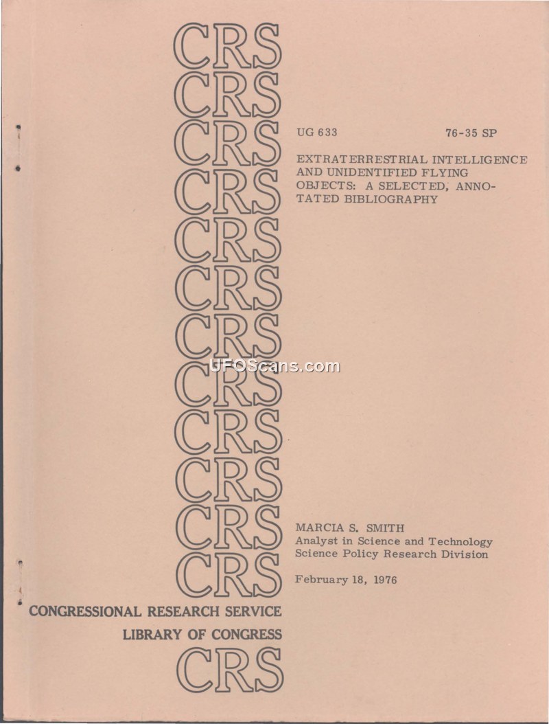 This 1976 Congressional Research Service document provides an annotated bibliography of literature concerning extraterrestrial intelligence and UFOs. It categorizes sources into scientific research on life in the universe and the broader, often controversial, field of UFO studies.