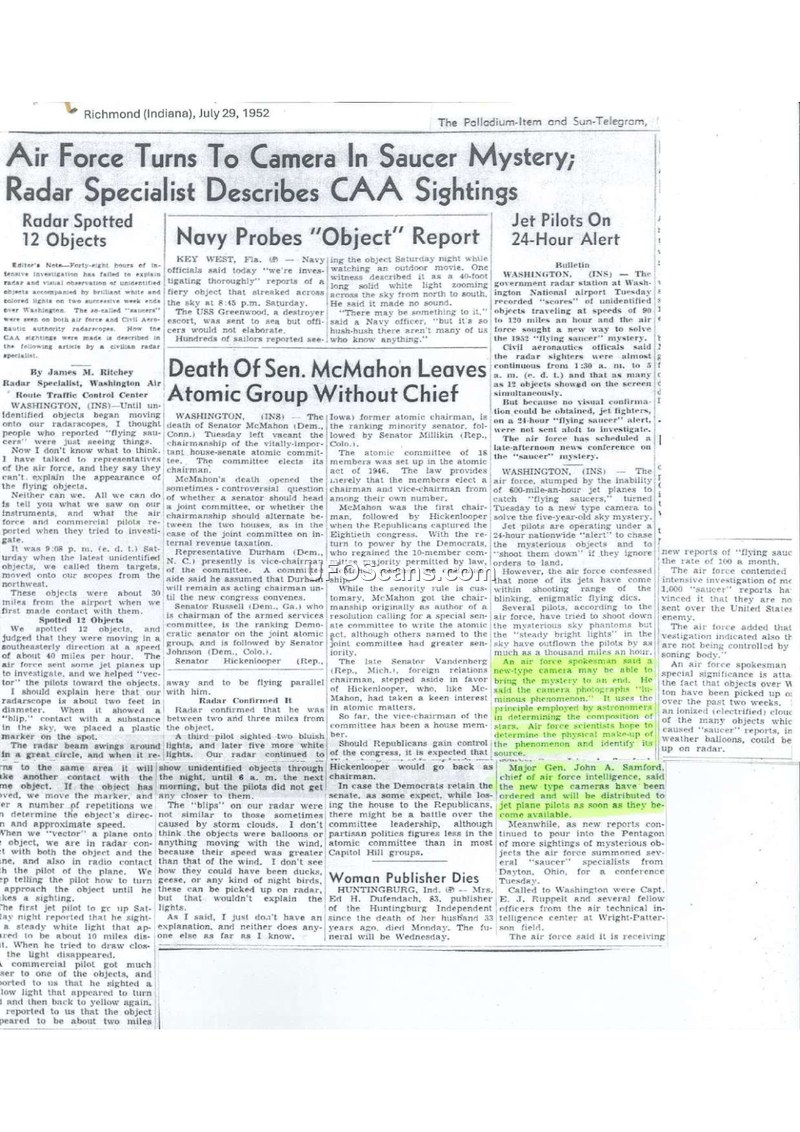 This newspaper report from July 29, 1952, details a series of sightings of unidentified aerial phenomena over Washington, D.C., and the subsequent response by the United States Air Force. Radar specialist James M. Ritchey of the Washington Air Route Traffic Control Center reported that on the night of July 26, 1952, twelve objects were detected on radar. These objects were observed moving in a great circle at approximately 9:08 p.m. The report notes that the Air Force is intensifying its investigation into these sightings, which have been colloquially referred to as 'flying saucers.' Major General John A. Samford, Chief of Air Force Intelligence, indicated that the Air Force is employing cameras to document these phenomena. Additionally, the article mentions that Captain J. Ruppelt and other intelligence officers were called to Washington to assist in the assessment of these reports. The document also provides context regarding the political landscape of the time, noting the death of Senator McMahon and the subsequent leadership changes within the Atomic Energy Committee.