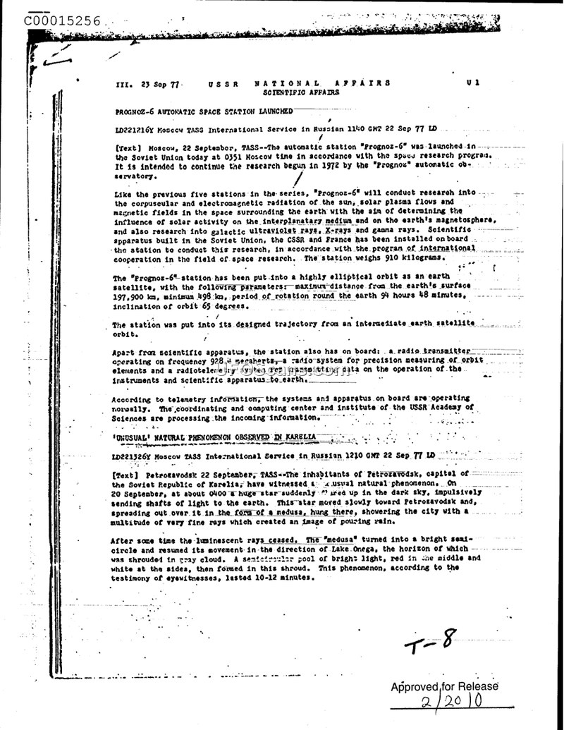This document contains TASS reports regarding the launch of the Prognoz-6 space station, a mysterious aerial phenomenon observed over Petrozavodsk in September 1977, and Soviet aviation records. The Petrozavodsk incident was witnessed by many and remains unexplained by local meteorological authorities.