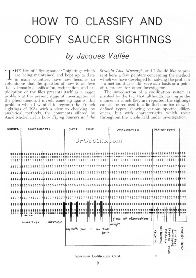 Jacques Valléé proposes a standardized system for classifying and codifying UFO sightings using punched cards to enable statistical analysis. The system categorizes sightings into four distinct types based on physical form and movement patterns.