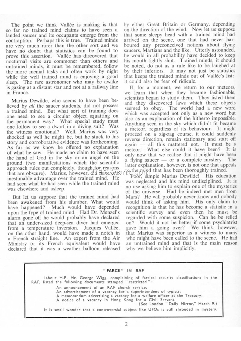 This document consists of two articles. The first, by Jacques Vallée, is the second part of a study titled 'Entities Associated with Type 1 Sightings: The Scientific Interpretation.' Vallée examines reports of 'giants' and 'men' associated with UFO landings, noting that many descriptions are unreliable due to psychological factors or misinterpretations. He specifically discusses the case of Marius Dewilde, suggesting that while Dewilde's account is difficult to verify, his status as an untrained witness makes him a compelling subject for study. Vallée concludes that there is no definitive evidence of extraterrestrial origin for these entities, and that many cases can be explained by natural phenomena, hoaxes, or misidentification of aircraft. He advocates for a more rigorous psychological investigation of witnesses. The second article, by Gilbert S. Inglefield, titled 'Fatima: The Three Alternatives,' discusses the 1917 Fatima incident. Inglefield explores the event as a potential UFO sighting, comparing the 'dancing sun' phenomenon to other reported aerial anomalies. He notes that the event was witnessed by 70,000 people and argues that it cannot be dismissed as a simple meteorological phenomenon or mass hallucination, though he stops short of confirming an extraterrestrial origin.