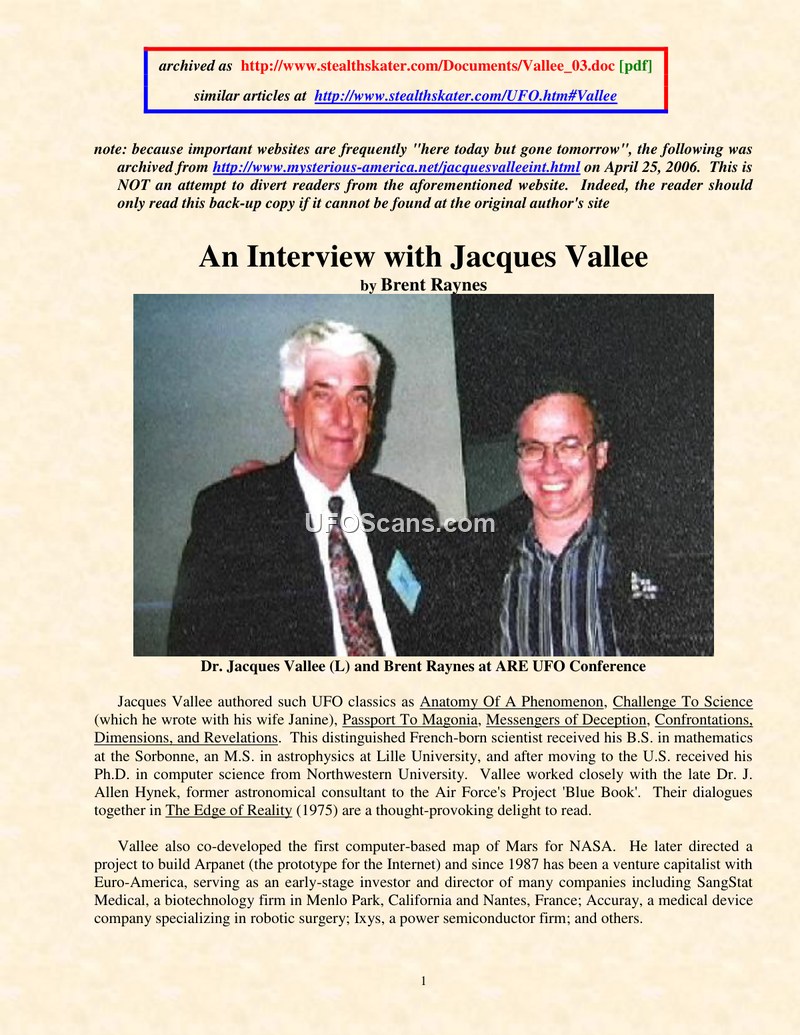 This document is an interview with Dr. Jacques Vallee conducted by Brent Raynes, originally archived on April 25, 2006. Vallee, a French-born scientist with a background in mathematics, astrophysics, and computer science, discusses his long-standing involvement in UFO research and his professional career. He details his early work with Dr. J. Allen Hynek on Project Blue Book and his later contributions to the development of Arpanet and NASA's Mars mapping project. Throughout the interview, Vallee emphasizes his shift away from mainstream ufology, which he characterizes as having become dogmatic and lacking in rigorous field investigation. He advocates for a broader, multidisciplinary approach to the study of Unidentified Aerial Phenomena (UAP), suggesting that the phenomenon is deeply linked to consciousness, human history, and spiritual traditions rather than simple extraterrestrial visitation. Vallee recounts his own childhood sighting of a silvery, dome-topped disk in France, which he notes influenced his interest in science. He also discusses his involvement with the Stanford Research Institute's remote-viewing program, where he suggested an information-processing approach to the subject. Furthermore, Vallee expresses strong reservations regarding the use of hypnotic regression in abduction research, citing concerns that it can create irreversible fantasies rather than uncovering true memories. He also touches upon his investigations in Brazil, noting the complexity of the phenomenon and the loss of data due to political and cultural factors. The interview concludes with Vallee's reflection on the need for continued, open-minded research that transcends current speculative models.