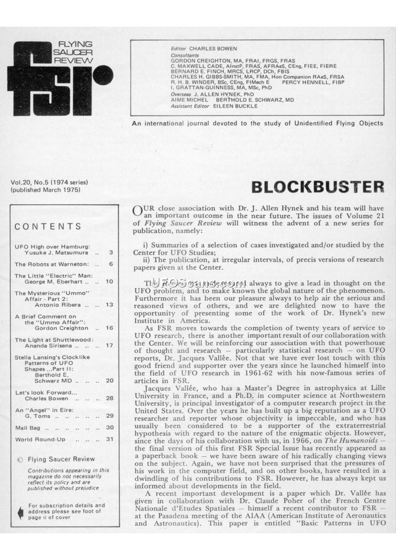 This 1975 issue of Flying Saucer Review details a new collaboration with Dr. J. Allen Hynek's Center for UFO Studies and highlights research by Jacques Vallée and Claude Poher. It also serves as a notice for subscription rate increases.