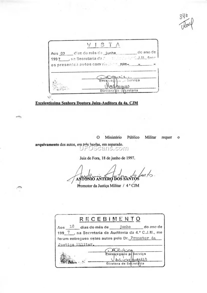 This document comprises a series of legal filings and a final decision regarding Military Police Inquiry (IPM) No. 18/97, initiated by the Commander of the School of Sergeants of Arms (EsSA) in Três Corações, Minas Gerais. The inquiry was launched to investigate allegations made by ufologists Vitório Paccacini and Mars Portes in their book, 'Incidente em Varginha'. The authors claimed that the Brazilian Army, the Military Police, and the Fire Department of Minas Gerais had captured extraterrestrial creatures in Varginha on January 20, 1996, and subsequently transported them to Campinas for analysis. The inquiry sought to determine if these claims constituted crimes against the honor of the Armed Forces or military discipline, specifically regarding the alleged disclosure of classified information and the incitement of military personnel to provide testimony under anonymity. The Military Public Ministry, represented by Prosecutor Antônio Antero dos Santos, concluded that the allegations were entirely unfounded and sensationalist. The investigation determined that no state or military institution was involved in any such event, and that the military activity observed on the date in question was merely routine maintenance. The prosecutor argued that the authors sought personal publicity through the media and that their claims, while ethically reproachable, did not constitute a criminal offense against the reputation of the Armed Forces. Consequently, the prosecutor requested the archiving of the case based on Article 397 of the Code of Military Penal Procedure (CPPM). The presiding Judge-Auditor, Télma Queiroz, concurred with the prosecutor's assessment, noting that the claims were 'inverossimil' (implausible) and had even served as fodder for the satirical television program 'Casseta e Planeta'. The decision to archive the inquiry was finalized on July 4, 1997, with the case officially closed and the legal deadline for appeals having passed by July 15, 1997.