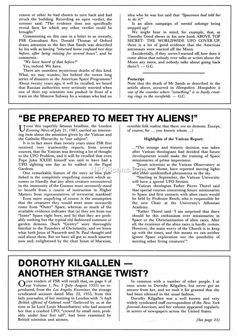This document is a compilation of reports and commentary regarding UFO phenomena, likely published by FSR (Flying Saucer Review). The text covers three distinct topics. First, it discusses the death of a man named Sands in Hampshire, noting that his wife claimed he had been missing for several hours prior to his death. The author links this to broader themes of UFO-related deaths and mentions Timothy Good's book, 'TOP SECRET: THE WORLDWIDE UFO COVER-UP,' which alleges that astronauts were warned off the Moon. Second, the document reports on the Vatican's interest in extraterrestrial life, citing a 'Vatican Report' that suggests the Vatican Observatory is monitoring unidentified phenomena in the sky and that the Vatican University is establishing a special UFO section. Father Pierre Thorel is quoted regarding the necessity of preparing missionaries for potential contact with alien races. Finally, the document revisits a 1955 account involving journalist Dorothy Kilgallen, who allegedly received information from Lord Louis Mountbatten about a crashed UFO and the recovery of small, four-foot-tall beings. The document serves as a collection of anecdotal evidence and commentary on the intersection of UFO sightings, government/religious institutional awareness, and historical media coverage.