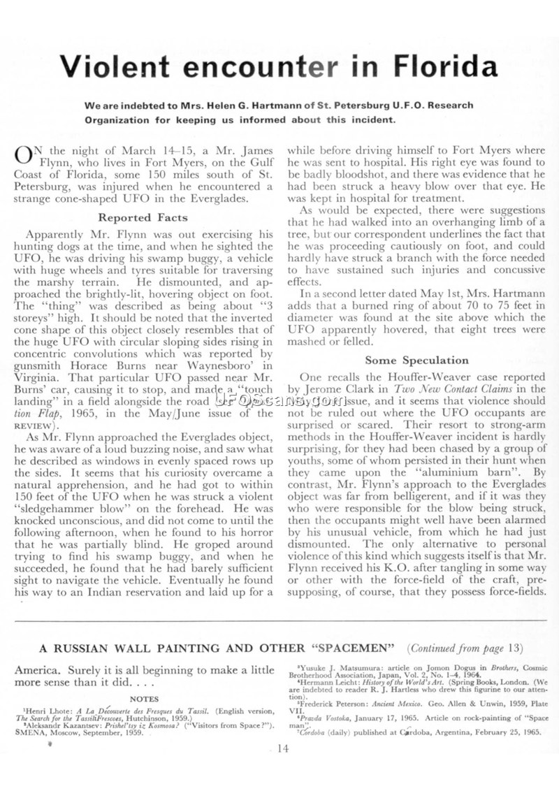This article details a reported encounter in the Florida Everglades on the night of March 14-15, 1965, involving a man named Mr. James Flynn. While exercising his hunting dogs, Flynn observed a brightly-lit, cone-shaped object approximately three stories in height. He reported hearing a loud buzzing noise. As he approached the object, he was struck by what he described as a 'sledgehammer blow' to the forehead, which rendered him unconscious. Upon regaining consciousness the following day, he found himself partially blind and eventually navigated to an Indian reservation for medical assistance. Medical examination revealed a bloodshot eye and evidence of a heavy blow. The article notes that while some suggested he may have walked into a tree branch, a follow-up letter from Mrs. Helen G. Hartmann of the St. Petersburg U.F.O. Research Organization reported that a burned ring, 70 to 75 feet in diameter, was discovered at the site, with eight trees mashed or felled. The author compares this incident to a previous report by Horace Burns regarding a similar object in Virginia and discusses the possibility that the witness was affected by a force-field associated with the craft.