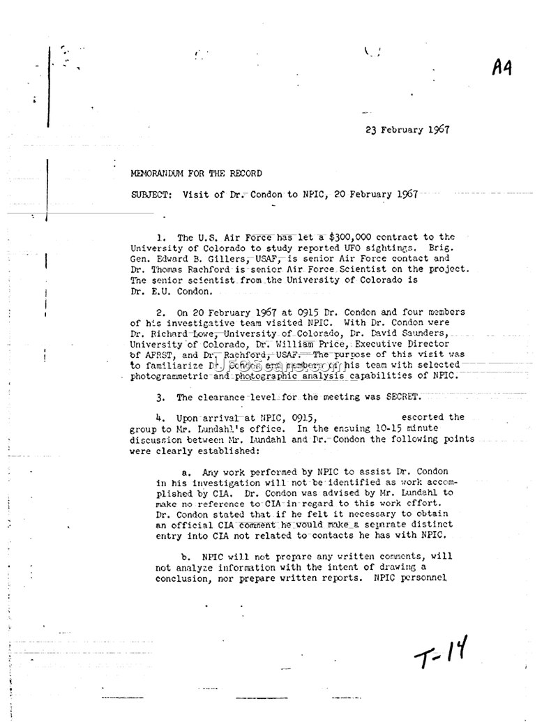 On 20 February 1967, Dr. E.U. Condon and four members of his University of Colorado investigative team visited the National Photographic Interpretation Center (NPIC). The visit was facilitated by the U.S. Air Force, which had contracted the University of Colorado to study UFO sightings. The team included Dr. Richard Lowe, Dr. David Saunders, Dr. William Price, and Dr. Thomas Rachford. The primary purpose of the visit was to introduce the team to the photogrammetric and photographic analysis capabilities available at NPIC. During the meeting, which was classified as SECRET, several ground rules were established. NPIC agreed to assist Dr. Condon with technical work, such as measuring objects in images, but stipulated that this work would not be attributed to the CIA. Furthermore, NPIC would not produce written reports or formal conclusions. The visit consisted of a series of briefings on photogrammetry, microdensitometry, and isodensitometry, as well as a tour of the facility to view equipment such as the Point Transfer Device, the Mann 800 Comparator, and the Benson-Lehner Plotter. The discussions were primarily unclassified and focused on the technical challenges of analyzing UFO photography, particularly regarding the lack of basic information like camera focal lengths. The group concluded their visit at 1235 hours to attend a meeting with Brig. Gen. Gillers at the Pentagon.