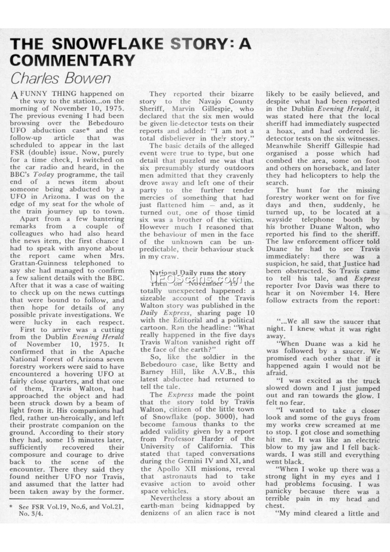 This document, titled 'The Snowflake Story: A Commentary' by Charles Bowen, provides an overview of the November 1975 disappearance and subsequent return of Travis Walton in the Apache National Forest, Arizona. Walton, a forestry worker, was part of a crew of seven men when they encountered a yellowish-white, disc-shaped object described as two pie pans, one upside down. According to the crew, Walton approached the object and was struck by a beam of light, causing the others to flee. Walton remained missing for five days before reappearing. The document details the subsequent media frenzy, the involvement of various investigative groups such as APRO and Ground Saucer Watch (GSW), and the use of polygraph tests on the witnesses. While some witnesses passed their polygraph examinations, the results for others were inconclusive. The text highlights the skepticism of local law enforcement, specifically Sheriff Marvin Gillespie, and the conflicting opinions of various experts, including psychiatrists and hypnotists like Dr. Gene Rosenbaum and Dr. Lester H. Steward. The document also touches upon the financial and logistical difficulties faced by the investigators and the family's interactions with the press and researchers. It concludes by noting the ongoing debate regarding the authenticity of the event, contrasting the claims of the witnesses with the suspicions of hoax and the varying interpretations of the evidence gathered.