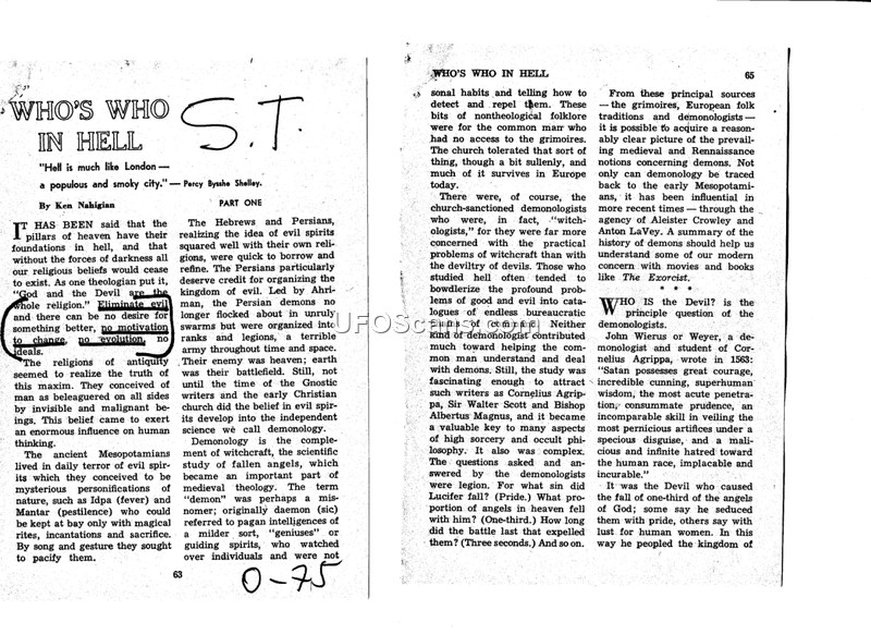 This article, titled 'Who's Who in Hell' by Ken Nahigian, provides a historical and thematic overview of demonology, occult traditions, and the classification of demonic entities as understood through various grimoires and theological texts. The author traces the evolution of the concept of evil spirits from ancient Mesopotamian, Persian, and Hebrew traditions through the medieval period and into modern occultism. The text details the hierarchical structures often attributed to demonic forces, citing specific grimoires such as the Lemegeton, the Grand Grimoire, and the Pseudomonarchia Daemonum. It explores the roles of various figures, including John Wierus, Cornelius Agrippa, and MacGregor Mathers, in codifying these beliefs. The article discusses the perceived nature of demons, their alleged abilities to influence human affairs, and the methods historically used to repel them, such as the use of holy relics or specific natural objects. Furthermore, it examines the folklore surrounding incubi and succubi, the role of the Church in shaping these narratives, and the intersection of demonology with literature, such as Dante Alighieri's works and John Milton's Paradise Lost. The document serves as a compendium of historical demonological lore, categorizing entities by their supposed functions, geographic domains, and ranks within a complex, albeit inconsistent, infernal hierarchy.