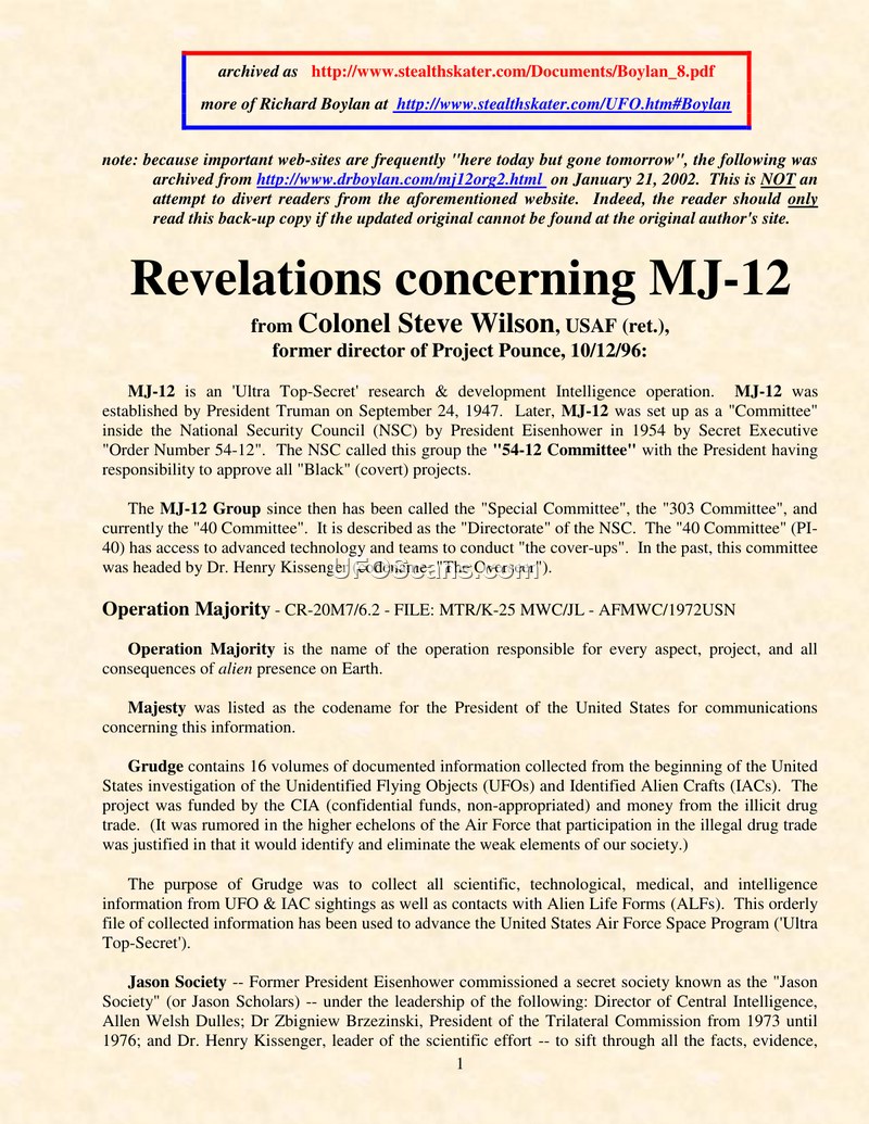 This document, authored by Colonel Steve Wilson (USAF, ret.) on October 12, 1996, provides an overview of the MJ-12 organization and its associated covert operations. According to the report, MJ-12 was established by President Truman in 1947 and later formalized by President Eisenhower under the National Security Council. The group, also known as the '40 Committee' or 'Special Committee,' serves as the primary directorate for managing all aspects of alien presence on Earth. The document outlines a complex structure of control, including the 'Jason Society,' a group of 32 prominent individuals, and 'MAJI' (Majority Agency for Joint Intelligence), which handles disinformation and intelligence evaluation. The report details various projects under this umbrella, such as 'Grudge' for data collection, 'Sigma' for communications with aliens, 'Plato' for diplomatic relations, and 'Pounce' for the recovery of crashed craft. It also describes the 'Country Club,' a secret facility in Maryland for MJ-12 members. The document asserts that these operations are funded through illicit activities, including the drug trade, to bypass Congressional oversight. It further claims that the NSA was created to protect the secret of recovered flying discs and that the NRO, through its 'Delta' arm, provides security for these projects. The report concludes by noting that these efforts have successfully kept the public in the dark regarding the alien question through the use of false experts and disinformation campaigns.