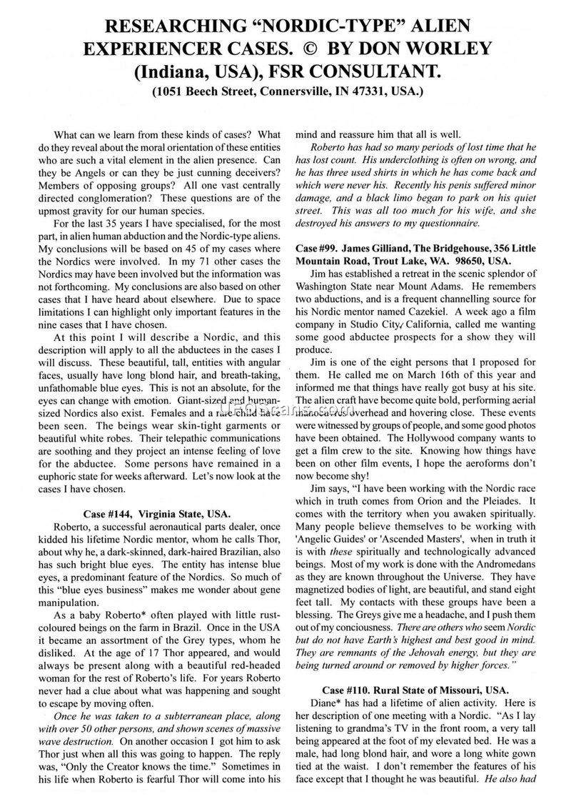 This document is a compilation of reports and observations regarding 'Nordic-type' alien encounters, authored by FSR consultant Don Worley and Jorge Martín. The text details various case studies involving individuals who claim to have had long-term interactions with tall, blonde, blue-eyed entities often referred to as 'Nordics'. These entities are frequently associated with telepathic communication, 'lost time' phenomena, and, in some instances, sexual encounters or physical manipulation. The author, Don Worley, examines the moral ambiguity of these beings, questioning whether they are benevolent 'Angelic Guides' or deceptive entities. Several specific cases are highlighted, including those of Roberto, James Gilliand, Diane, Penny, and Donna, each describing unique experiences ranging from abduction and channelling to physical traces left on their properties. The document also includes a report from Puerto Rico by Jorge Martín regarding a sighting of two small entities in silver suits that caused electromagnetic interference with a vehicle. The overall tone is one of cautious investigation, with the author noting that while some experiencers view these beings as positive, others report negative physiological and psychological impacts. The document serves as an overview of the 'Nordic' phenomenon within the context of late 20th-century ufology.