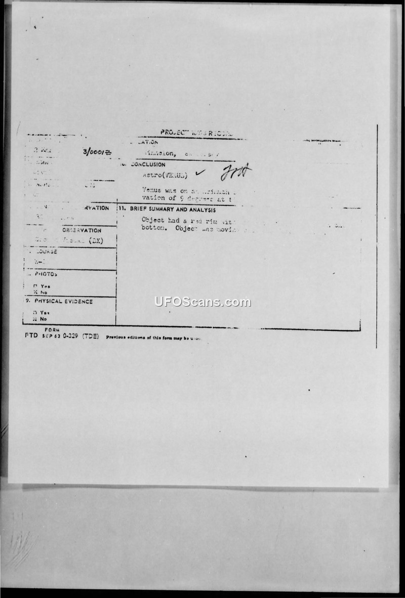 A 1967 U.S. Air Force sighting report from Kinnelon, New Jersey, where a witness described a saucer-shaped object. The Air Force officially concluded the object was the planet Venus.