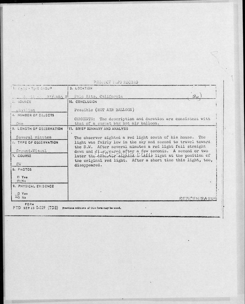 A 1968 UFO sighting in Palo Alto, California, was investigated by the Air Force's Aerial Phenomena Office. The official conclusion identified the object as a 'garmet bag hot air balloon'.
