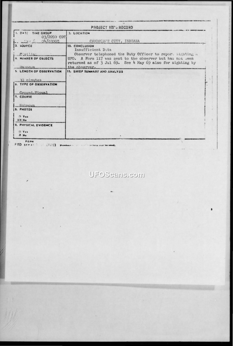 A civilian in Cambridge City, Indiana, reported a UFO sighting in May 1969. The Air Force deemed the report insufficient for investigation and requested further details via a follow-up form, which was never returned.