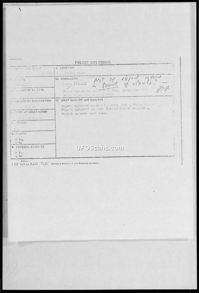 A 1967 UFO sighting in Xenia, Ohio, was investigated by the Air Force's Project Blue Book. The phenomenon was officially identified as the planet Venus.