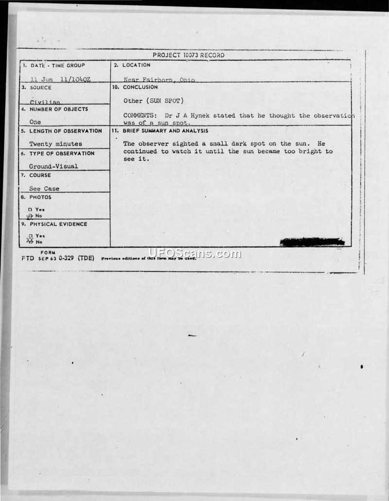 On 11 June 1968, a civilian observer in Fairborn, Ohio, reported a sighting of an unidentified object. The observer, who was driving at the time, described seeing a small, dark, egg-shaped object against the sun. The observation lasted for approximately fifty minutes. The witness noted that the object appeared to 'flutter' or move, and they were adamant that it was not a plane, star, or weather balloon. The witness provided a detailed questionnaire, including sketches of the object's position relative to the sun. The Air Force, through the Foreign Technology Division's Aerial Phenomena Office, investigated the report. Lt. Col. Hector Quintanilla, Jr. consulted with Dr. J. Allen Hynek of Northwestern University regarding the sighting. Based on this consultation, the official conclusion reached by the Air Force was that the observer had witnessed a sun spot. The Air Force subsequently sent the observer information regarding sun spots to explain the phenomenon.