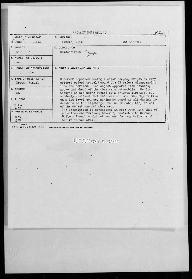 A former WWII veteran reported a silent, cigar-shaped, silver object near Kansas, Ohio, on June 8, 1966. Project Blue Book investigated the report and concluded it was 'Unidentified' after ruling out local balloon activity.
