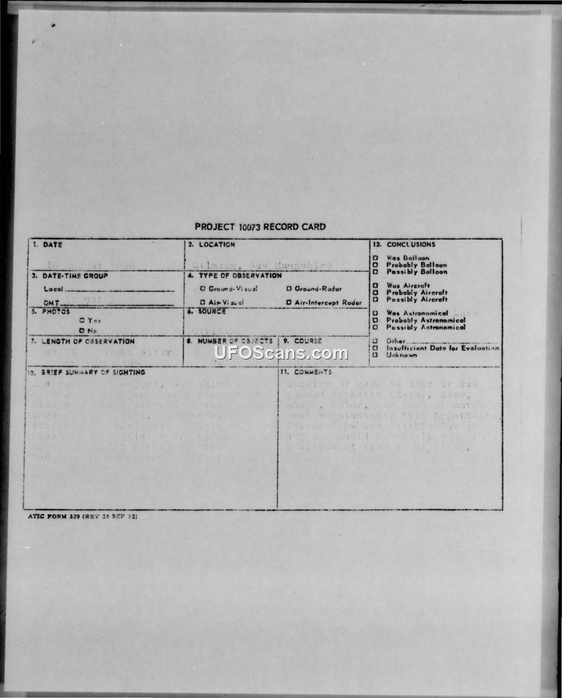 Project 10073 Record Card - Sighting Report, Gilmanton, New Hampshire
