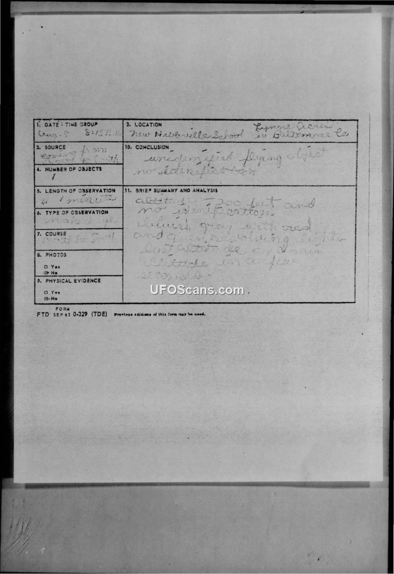 This document is a standard U.S. Air Force sighting report form (FTD SEP 63 0-329) detailing an unidentified aerial phenomenon observed on August 8 at 8:15 P.M. The incident occurred at the New Habbesville School in Lynne Acres, Baltimore County, Maryland. The witness reported a single object traveling from North to South at an estimated altitude of 200 feet. The object was described as being bluish-gray in color with red revolving lights. The observation lasted for approximately one minute. The report concludes that the object remained unidentified. The second page of the document contains a mailing address to U.S. Air Force Headquarters in Washington, D.C., and includes a stamp marked 'SAFOI'.