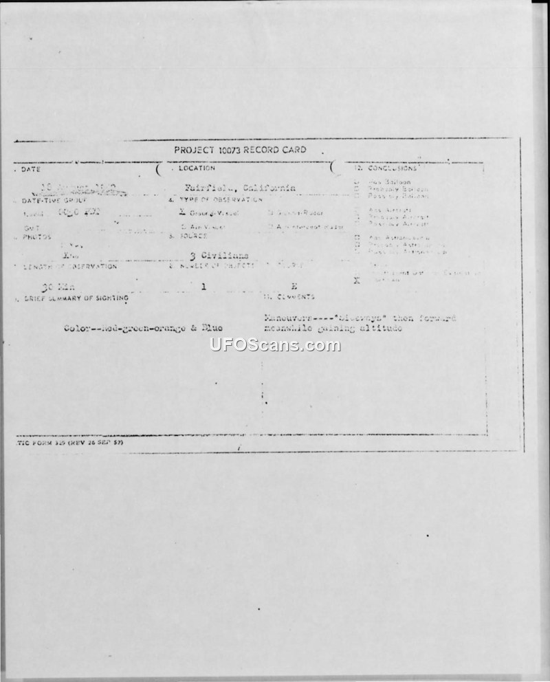 Project 10073 Record Card and Field Report — Fairfield, California, 18 August 1952