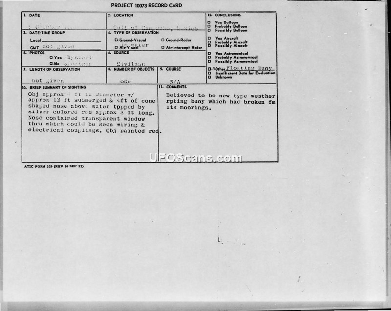 An unidentified floating object sighted in the Gulf of Campeche in 1958 was investigated by the 1006th AISS. The object was determined to be a detached weather reporting buoy from the U.S. Coast Guard.