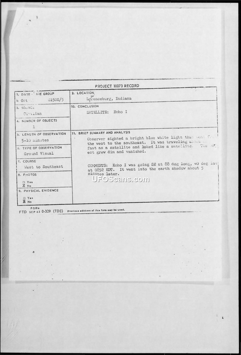 On October 4, 1967, a 14-year-old male witness in Lawrenceburg, Indiana, reported observing an unidentified aerial phenomenon. The witness described seeing a bright, blue-white light moving from the west to the southeast. The object, which the witness noted appeared as a light and was slightly brighter than Venus, remained in sight for approximately 5 to 10 minutes before growing dim and vanishing. The witness, who had previously reported other sightings, used binoculars during the observation. Following the report, the U.S. Air Force's Aerial Phenomena Office, under the direction of Major Hector Quintanilla, Jr., conducted an evaluation. The official conclusion reached by the Air Force was that the witness had observed the Echo I satellite. The evaluation noted that at 8:52 PM EDT, the satellite was positioned at 88 degrees longitude and 40 degrees latitude, making it visible from the witness's location in Western Indiana. The satellite subsequently passed into the earth's shadow approximately five minutes later, which aligns with the witness's account of the object dimming and disappearing.