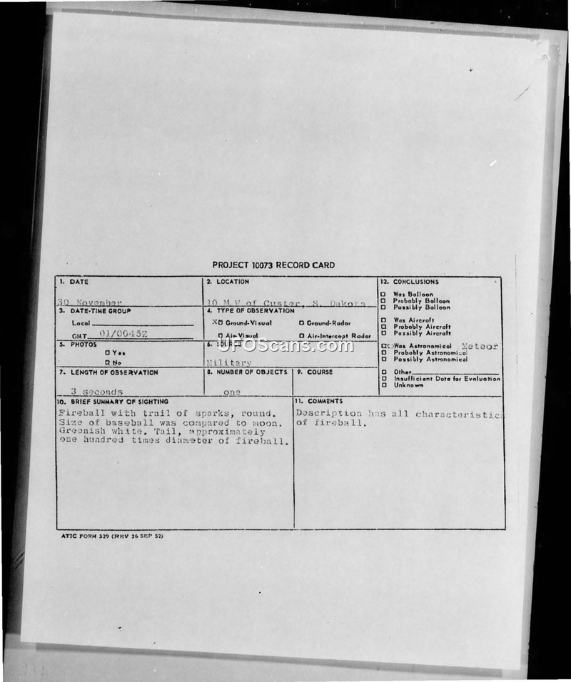 Project 10073 Record Card: Sighting near Custer, South Dakota, 30 November 1954