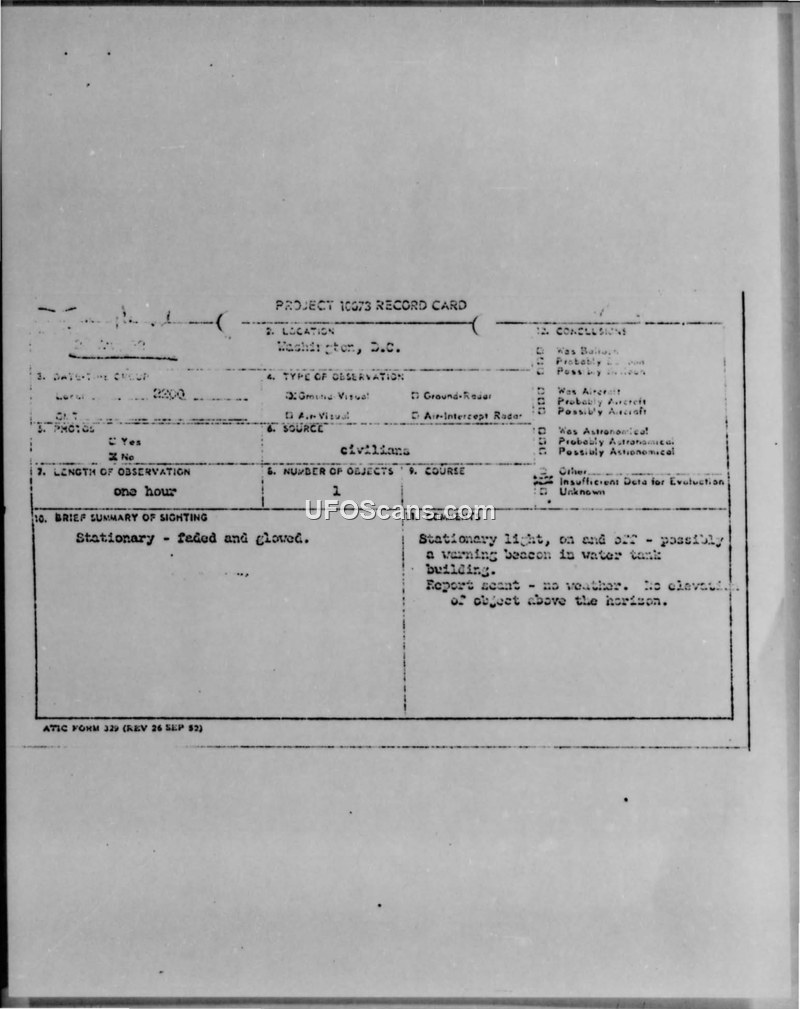 On 28 August 1952, at approximately 2200 hours, a group of six individuals, including a Navy veteran, observed an unidentified object over Washington, D.C. The object was described as a stationary light that faded and glowed at intervals. The observation lasted for approximately one hour. During this time, two aircraft passed over the area, and the object reportedly faded and reappeared after each aircraft had passed. The witnesses observed the object using binoculars. The weather was reported as clear with perfect visibility. The report notes that the object lacked aerodynamic features, trails, or exhaust. The witness, who claimed familiarity with astronomy and aircraft types, had his reliability marked as unknown. Official comments on the record card suggest the light might have been a warning beacon on a water tank building, though this remains speculative. The final evaluation by the Air Technical Intelligence Center (ATIC) concluded that there was insufficient data for a definitive evaluation.