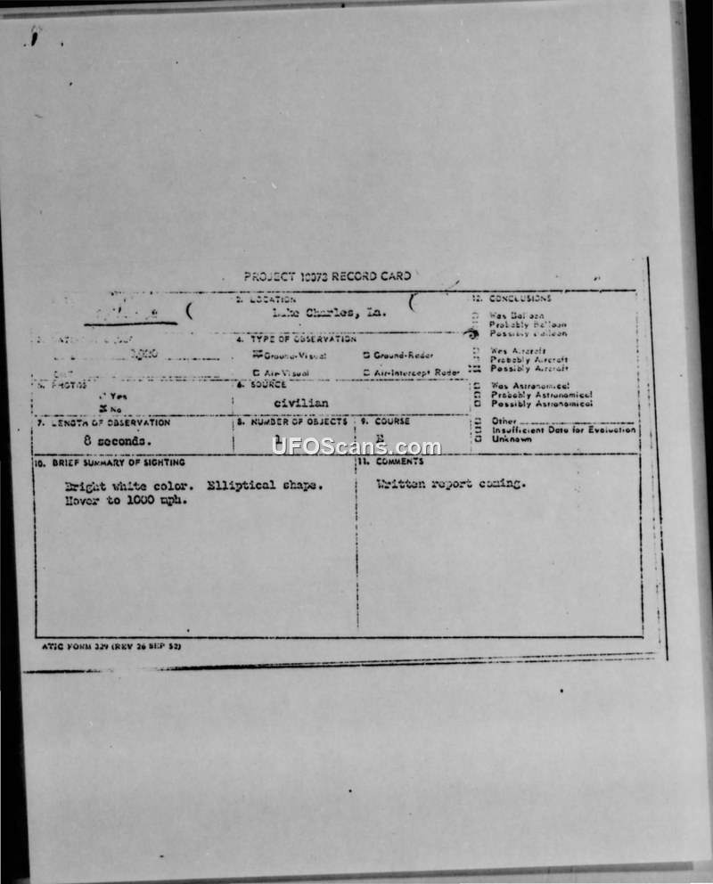 Project 10073 Record Card and Air Intelligence Information Report — Lake Charles, Louisiana, 29 August 1952