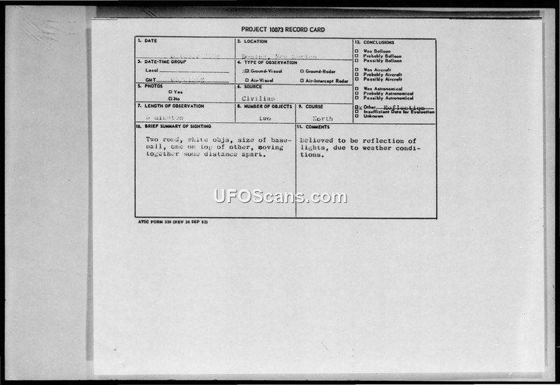 This document contains a Project 10073 record card and subsequent military communications regarding a sighting near Delta, Utah, on September 11, 1952. Initially, a private pilot reported seeing a silver object high over his farm that wobbled, created a vapor trail, and dove to earth, causing a dust eruption. The witness, who was unable to locate the object immediately due to heavy sagebrush, initially suspected it might be a jet aircraft. The initial record card entry, dated September 1952, suggests the sighting was believed to be a reflection of lights due to weather conditions. However, follow-up military cables dated September 11 and 12, 1952, clarify the incident. The witness later located the object in his field and identified it as a 129-gallon wing tank from a jet aircraft (Foxtrot 86). The documentation concludes with the identification of the object as a piece of military hardware rather than an unidentified aerial phenomenon.