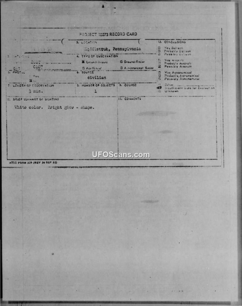On 12 September 1952, at 0107Z, a civilian employee at Olmsted Air Force Base in Middletown, Pennsylvania, reported observing an unidentified flying object. The witness, who was on dike patrol at the time, described the object as a bright, white light, roughly the size of an automobile headlight. The object moved in a straight line from the southwest to the northwest at a speed described as slower than an airplane. During the three-minute observation, the witness noted that the light dimmed significantly for approximately five seconds before regaining its original brilliance. The witness also reported that the object disappeared behind a tree and that the noise associated with the sighting ceased when the object vanished. Weather conditions were reported as clear with twelve miles of visibility and calm winds. In the subsequent Air Intelligence Information Report, investigators noted that while the witness insisted the object was not an aircraft, its level flight and speed suggested the possibility of an aircraft. The report explicitly states that the office could offer no definite explanation for the sighting, noting that the duration of the observation made astronomical phenomena like meteors unlikely. The witness provided additional details in a questionnaire, including a mention of hearing sounds like heavy artillery firing in the distance, though no sound was noted during the primary sighting event.