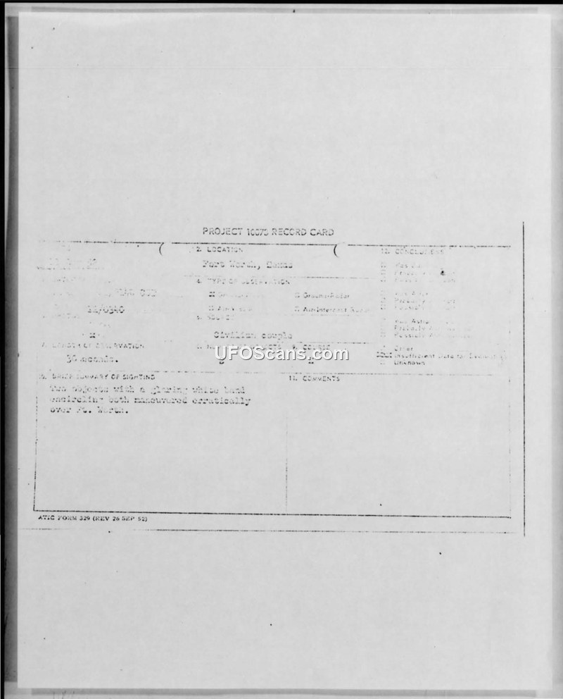 The document contains a record card for a sighting of two objects over Fort Worth, Texas, and a separate technical analysis of a fireball observed on September 12, 1952, over Flatwoods, West Virginia.