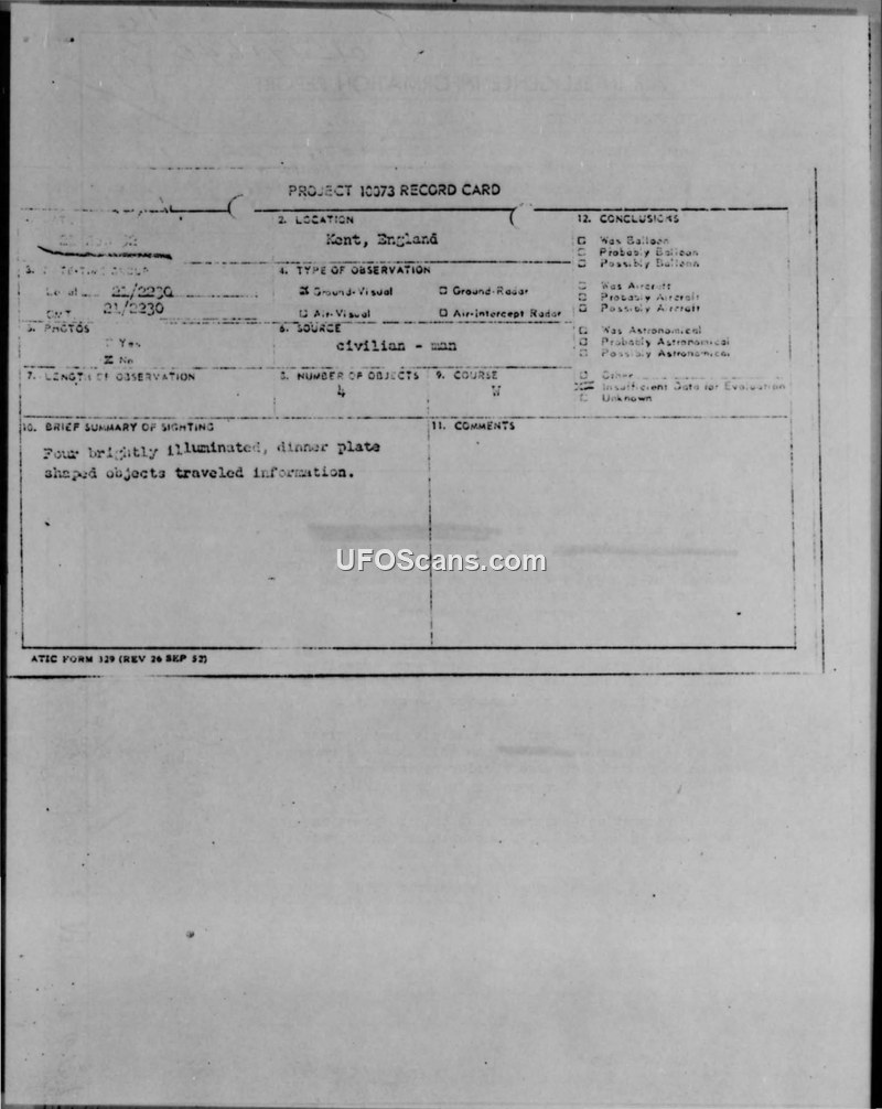 Project 10073 Record Card — Kent, England, 21 September 1952