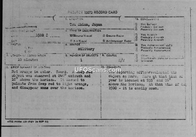 Three airmen reported a red, pulsing light in the sky over Tsu Shima, Japan, on 28 September 1952. Intelligence officers concluded the object was the planet Mars.