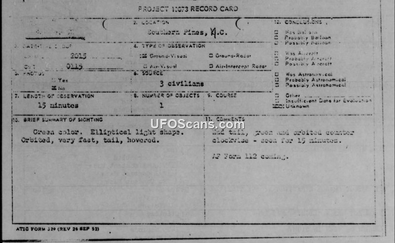 This document details a 15-minute sighting of a green, elliptical, high-speed object in Southern Pines, NC, on September 29, 1952. The report includes official project documentation and related correspondence regarding the event.