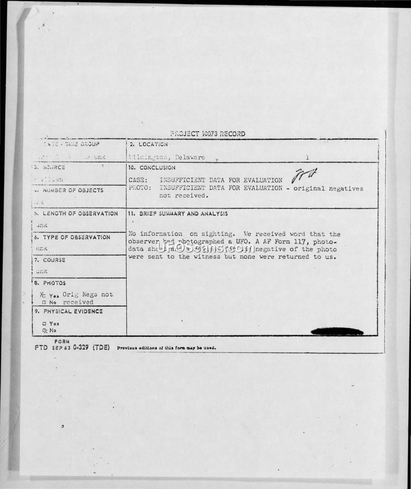 Project 10073 Record — Wilmington, Delaware Sighting