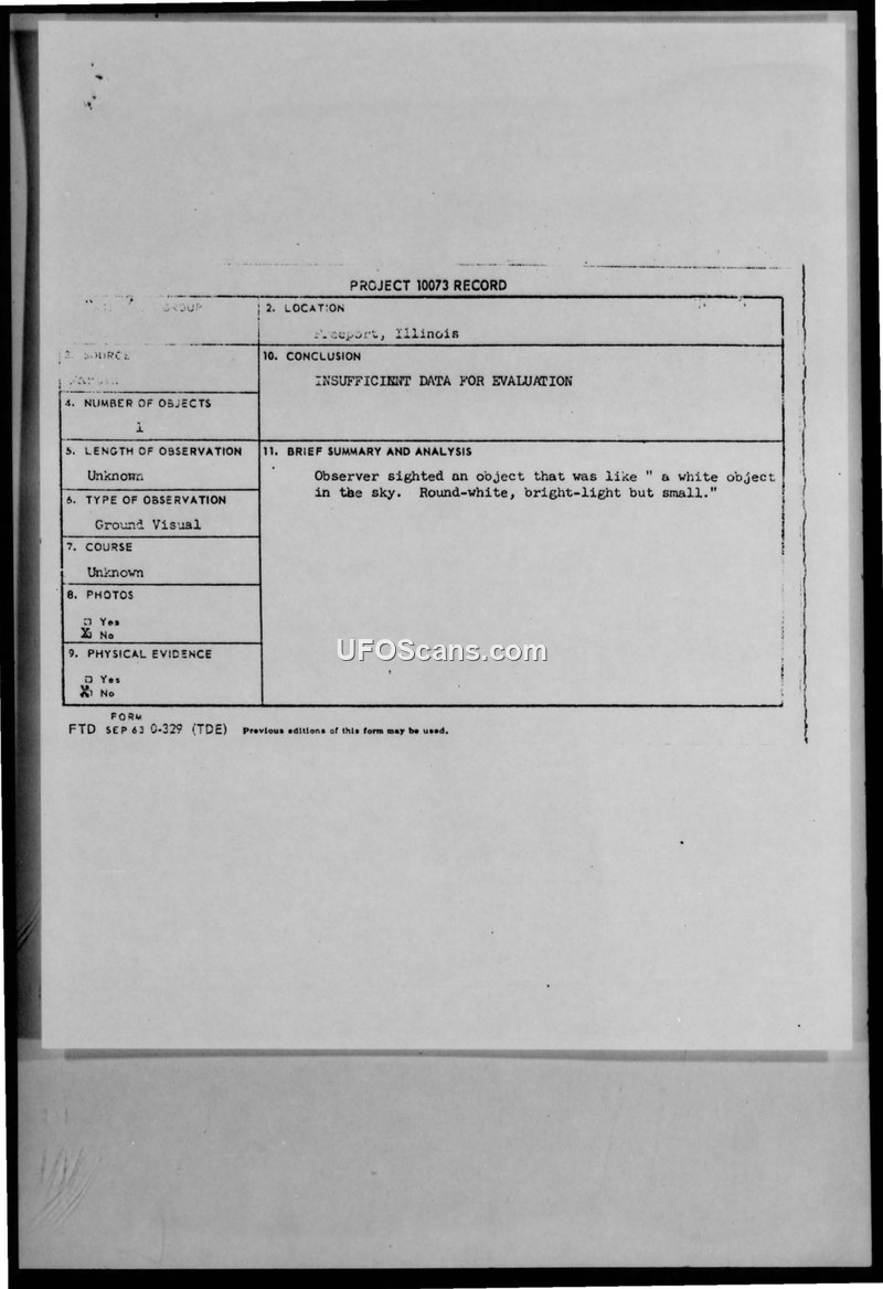 A 1967 UFO sighting report from Freeport, Illinois, was deemed insufficient for investigation by the Air Force's Foreign Technology Division. The witness was requested to provide more information via an AF Form 117.