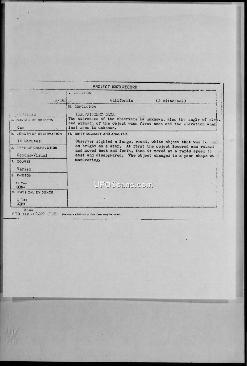 This document consists of a Project 10073 record and associated correspondence regarding a UFO sighting that occurred on November 8, 1967, near the north end of Lake Isabella, California. Two civilian witnesses reported observing a single, large, round, white object that appeared as bright as a star. The object reportedly lowered and raised itself, moved back and forth, and then departed to the east at a rapid speed. During these maneuvers, the object was observed to change into a pear shape. The observation lasted approximately ten minutes, and the witnesses reported that there was no sound associated with the object. The weather conditions at the time were described as clear and calm. Major Hector Quintanilla, Jr., Chief of the Aerial Phenomena Office, evaluated the report and concluded that there was insufficient data to reach a definitive explanation, noting that the addresses of the witnesses were unknown and that critical observational data, such as elevation and azimuth angles, were missing. The report mentions that the witnesses were considered reliable and that they had previously reported a similar sighting in Susanville, Lassen County, California. The correspondence indicates that the Air Force Flight Test Center (AFFTC) at Edwards AFB was requested to forward AF Form 117 to the witnesses to gather further information.