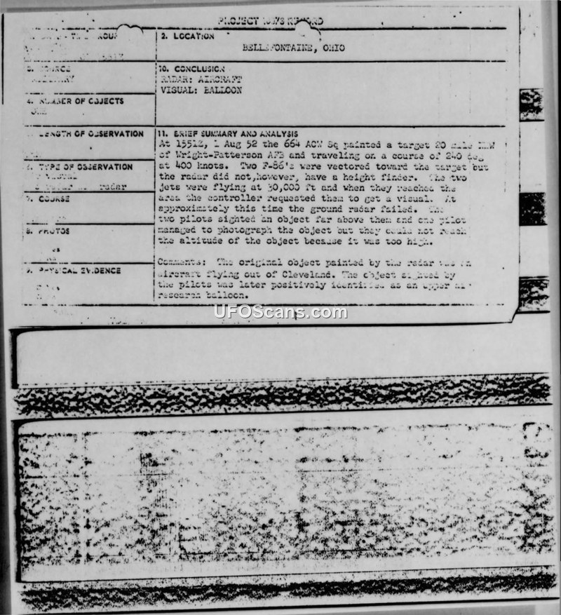 Project Blue Book Case #9: Bellefontaine, Ohio Sighting, 1 August 1952